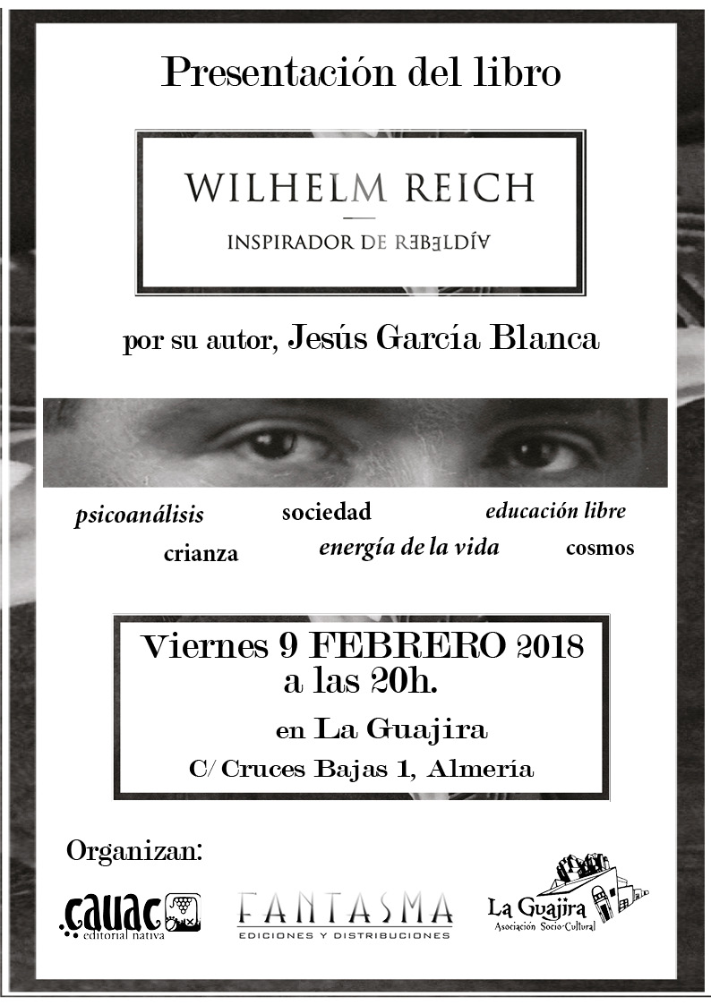El próximo viernes 9 de febrero a las 20h. tendrá lugar la presentación del libro «Wilhelm Reich, inspirador de rebeldía» a cargo de su autor, Jesús García Blanca, y con la presencia de los editores, Cauac editorial nativa. Será en La Guajira, C/Cruces Bajas nº 1, en Almería.