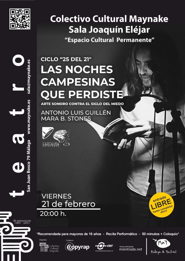 El viernes 21 de febrero a las 20:00, A.l. Guillén realiza un recital poli-poético acompañado de las imágenes de Mara B. Stones, en la Sala Maynake (C/San Juan Bosco, 79, Málaga).